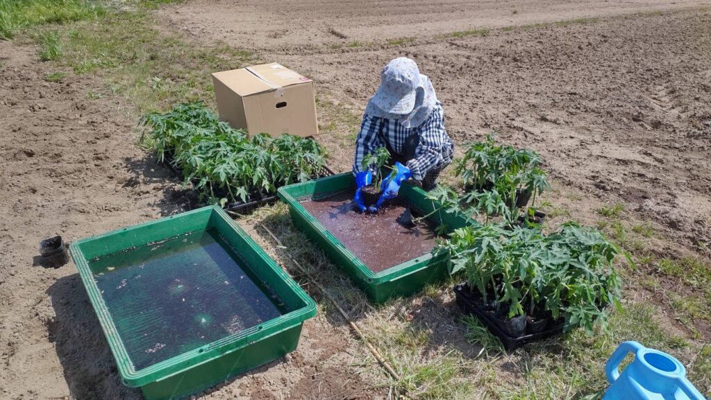 パパイヤの苗は繊細なため一つ一つ丁寧に作業で植えていきます。植え付けの前に、苗の根元をたっぷりと水に浸します。乾いた根に水分が染みわたり、苗はぐんと元気を取り戻したよう。水を含んだ苗は、土に植えられたあとも根付きやすく、すくすくと育っていきます。